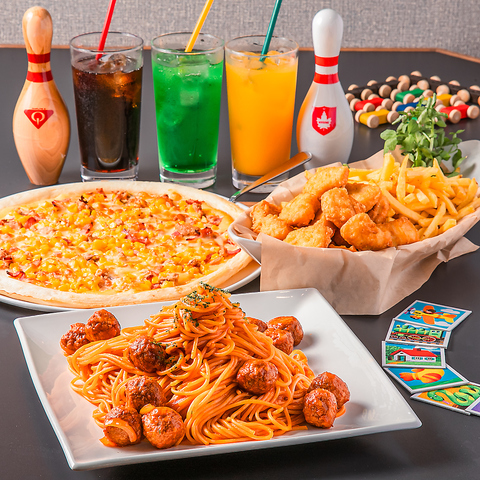 学校のクラス会やご家族でのご利用におすすめのパーティーコースとなります!コース料理にソフトドリンク飲み放題90分、ボウリング、レンタルシューズがついて高校生以下の方は3700円~ご利用いただけます!大人の方も一緒にご利用いただけるのでぜひお気軽にご予約くださいませ!