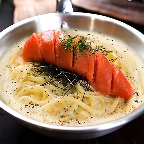 味の明太子「ふくや」の上質な明太子をまるまる1本使用した、当店自慢の1品です!自家製麺のもちもちしたパスタに明太子とクリームが絡んでうまかよ~!
