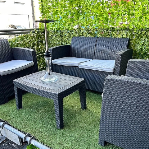 【テラス席】自然の光が差し込む開放的で心地よいテラス席。屋外の景色を眺めながら、シーシャの優雅な香りに包まれて、深いリラクゼーションを感じていただけます。おひとり様でも、穏やかな街並みに溶け込むような空間でゆったりとした時間を満喫できます。ペット同伴OKですので、愛犬とのリラックスタイムにも最適です!