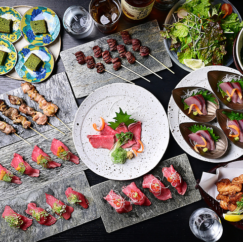 "錦爽鶏"の焼鳥"段戸山高原牛"肉寿司をお愉しみいただける飲み放題付コースをご用意しております。