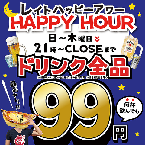 19時迄退店or21時以降の入店限定で生ビールなどほぼ全てのドリンク99円!安く飲むならかっちゃん!