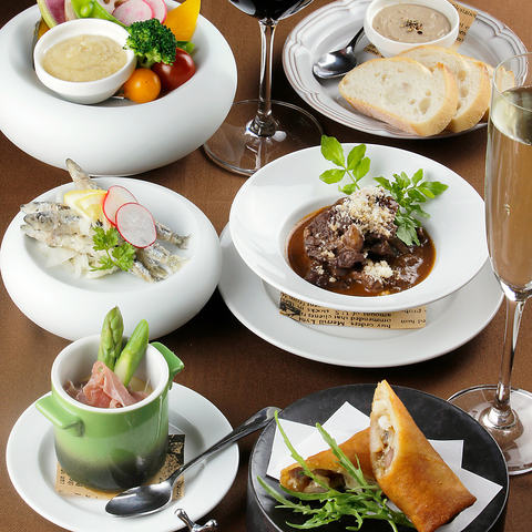 スパークリングワイン、ハートランド生ビール、こだわりカクテル等、飲み放題付きのプラン!料理は少しづつ色んな料理を楽しめる内容の全9品!人気のバーニャカウダや定番カルパッチョ、鶏モモ肉のフリットや牛ロースのグリルなど、お肉料理も充実!しめのパスタもついて、おなかも心も満たします!
