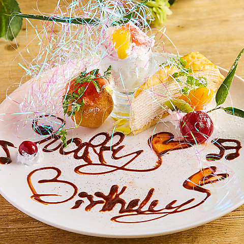 事前予約で誕生日、記念日のお祝い事にぴったりのメッセージ付きデザートプレートを1000円にて贈呈致します
