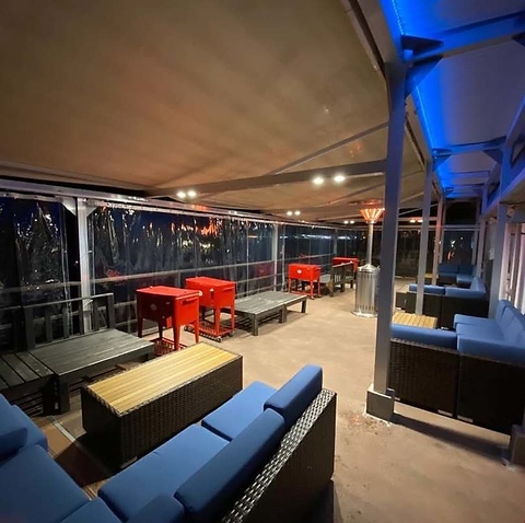 お昼の一面とはまた違う雰囲気を楽しむことが出来ます!明るくライトアップされた店内と、水面に映る照明の星々を眺めながら、仲間たちとワイワイ楽しみましょう♪
