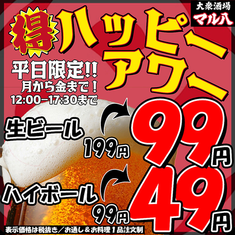 さらなる安さを追求します!!平日の月曜から金曜まで開催♪12時から17時30分までのご注文に限り、ハイボールが99円→49円!!生ビールは199円→99円!!サワー系ドリンクは通常価格でメガジョッキで提供しちゃいます♪【姫路 居酒屋 大衆酒場 寿司 牡蠣 天ぷら 海鮮 肉刺し 餃子 宴会 女子会 忘新年会 歓送迎会】