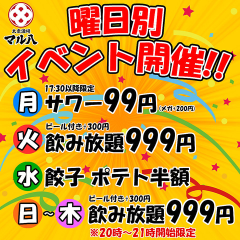 曜日別イベント開催しましたーっ!!曜日毎に変わるお得な特典でさらに安く楽しめるっ!!サワー99円、飲み放題999円、ポテト&餃子が半額など嬉しい特典が盛りだくさんです♪【姫路 居酒屋 大衆酒場 寿司 牡蠣 天ぷら 海鮮 肉刺し 餃子 宴会 女子会 忘新年会 歓送迎会 ハイボール99円 生ビール199円 メニュ-100種類以上】