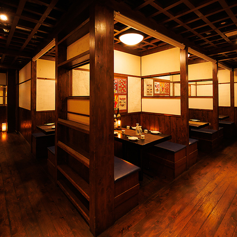 間接照明が心地よい半個室を多数完備!各席に仕切りがあり、周囲を気にせずゆったりと料理とお酒を楽しめます!昭和レトロなポスターが彩りを添え、どこか懐かしくホッと落ち着ける雰囲気の空間です!