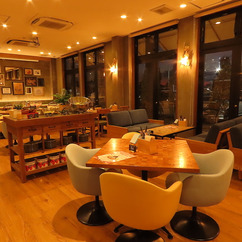 | ソファー | 2名様×1 | 開放的なテーブルソファー席をご用意しております。少人数でも大人数でもご利用頂けます♪デートやカフェ利用、お待ち合わせまでの空いた時間など様々な場面でご利用ください。オシャレな雰囲気溢れる店内でお食事をお楽しみいただけます。 |