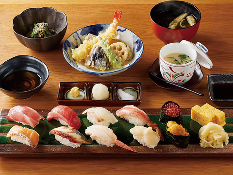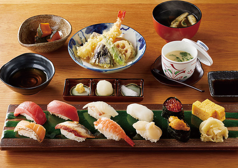 - 寿司御膳(寿司 10 貫、小鉢、茶わん蒸し、お椀、天麩羅)