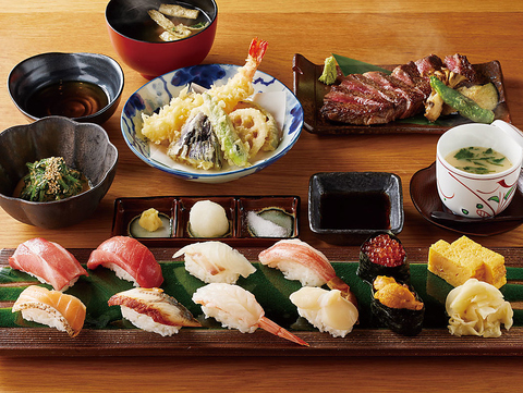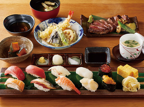 - 紫翠御膳(寿司10貫、小鉢、茶わん蒸し、お椀、天麩羅、ミニステーキ)