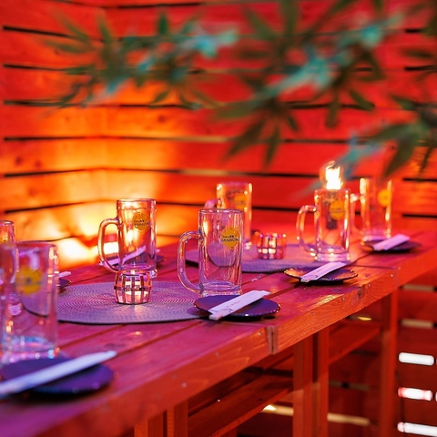ビアガーデン気分を盛り上げるウッド調のテーブル席は、BBQでも手狭にならないよう十分にゆとりを持った広さのお席。テーブルは自由自在に移動することが出来るため、ご来店人数に合わせたレイアウトをいたします。気持ちの良い屋上テラス席で極上のひと時をお過ごしください♪