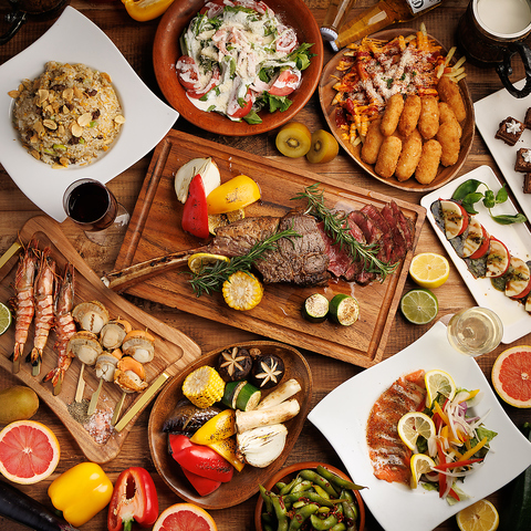 手ぶらBBQ7種が3時間食べ飲み放題プランが登場!熟成サーロインや牛ハラミ、自家製ローストビーフなど、肉好きにはたまらない豪快シュラスコ7種が食べ放題!その他サーモンカルパッチョやシュリンプチップス、選べる〆のご飯&デザート付きで大満足のBBQパーティープランをビール片手にお楽しみください!