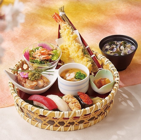 彩り豊かな寿司9貫に天ぷらや焼き物など当店の美味を組み合わせた人気の御膳。ご家族やご友人など大切な方とのお食事にふさわしい贅沢ランチ。寿司9貫(本鮪赤身・白身・銀鮭・〆鰊・ズワイ蟹・真ふぐ・海老・いくら・一本穴子) /生ハムサラダ/天ぷら3点盛(海老、蓮根、獅子唐)/ 茶碗蒸し /しじみ味噌汁/わらび餅