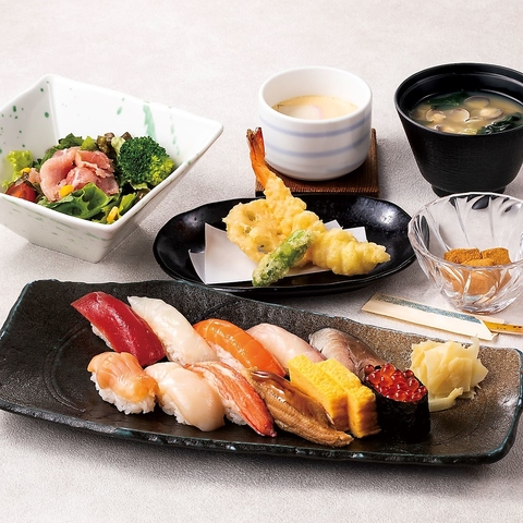寿司9貫【本鮪赤身・白身・銀鮭・〆鰊・ズワイ蟹・真ふぐ・海老・いくら・一本穴子】生ハムサラダ/天ぷら3点盛/茶碗蒸し/しじみの味噌汁/わらび餅