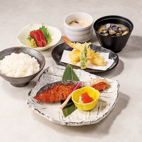 炭焼・寿し処 くし路 KITTE 丸の内店 _銀鮭炭焼き御膳(平日限定) 銀鮭炭焼き/お刺身/天ぷら3点盛/茶碗蒸し/ご飯/しじみ味噌汁