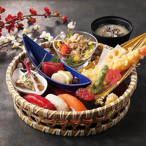「くし路」の美味を彩り豊かに、かごに詰め込みました。見た目も華やか心もほっこりする冬のご馳走です・蒸し鶏とごぼうの胡麻和えサラダ・鰤西京難波焼(ぶりさいきょうなんばやき)・天ぷら:大海老、蓮根、ししとう、梅花煎餅・ずわいがに茶碗蒸し ・寿司:本鮪、真ふぐ、銀鮭、いくら・しじみ味噌汁