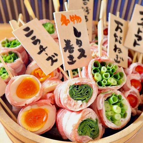 一本一本丁寧に仕込み、特製の出汁を染み込ませ、炭火で一気に焼き上げる絶品の串焼!ボリュームも満点!でも野菜たっぷりでヘルシーで女性にも嬉しい逸品です!そんな大人気の野菜巻き串をご堪能ください!※数量限定のため、売り切れの場合がございます。
