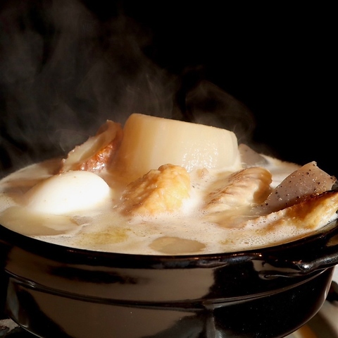 当店自慢の鶏白湯出汁のおでん。食材を3時間出して煮込んでいるので、中までしっかり味が染みています。この寒い冬に相性抜群!ビールや日本酒、色んなお酒と合います。