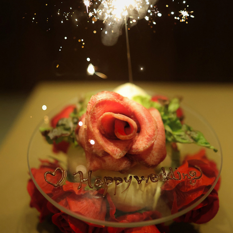1日1組限定のサプライズプレート『肉の花束』感謝の気持ちやお祝いの言葉を添えて主役に贈りませんか?炭焼牛たたきもしくは牛たん(牛たんしゃぶしゃぶをご注文の場合)でご用意をさせていただきます。