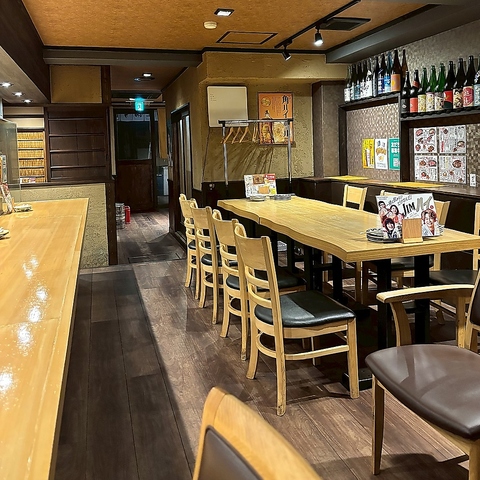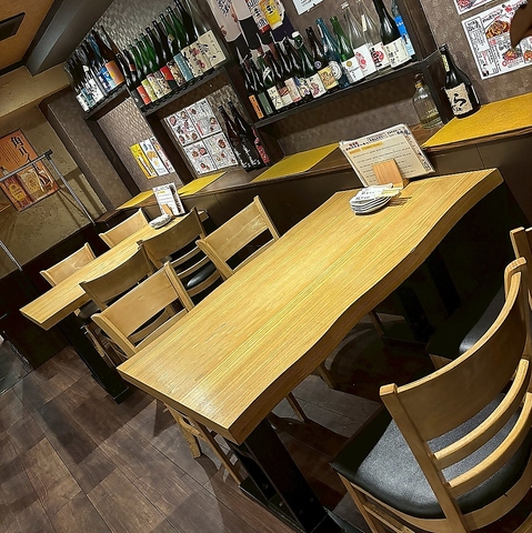 落ち着いた照明が灯る店内は、木の質感を活かした温かみのあるインテリアで統一されています。ゆったりと配置されたカウンター席や、グループで賑やかに過ごせるテーブル席など、どのお席も居心地の良さを追求しました。京都の街中にありながら、日常の喧騒を忘れてゆっくりとお食事とお酒を楽しめる、大人の隠れ家のような雰囲気が自慢です◎