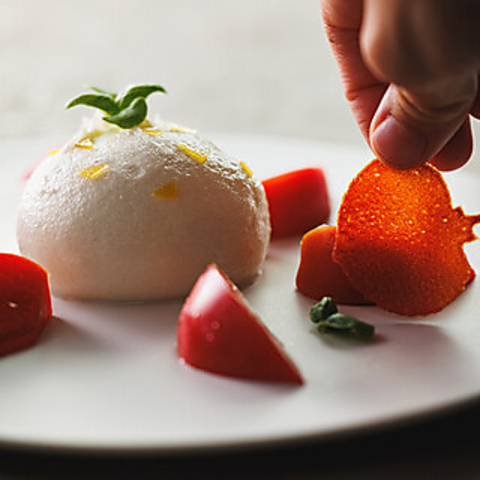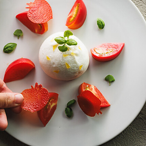 イタリア産のブッラータとフルーツトマト、トマトで作ったトマト型のチュイール、世界中にファンをもつ""セドリック・カサノヴァ”のオリーブオイルを3種から