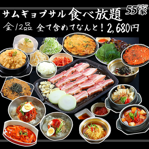 大人気のサムギョプサルを食べ放題でお楽しみください!基本メニューのキムチやサラダ、焼き野菜や巻き野菜、チゲやライスが付いたコスパ最強の全11品◎プラス1490円(税込)でチャミスルや生ビール等飲み放題が付けられます♪55マッチャンでしか食べれない絶品サムギョプサルをぜひご堪能ください!
