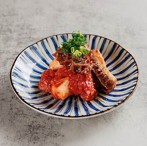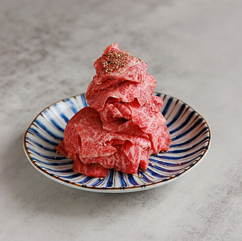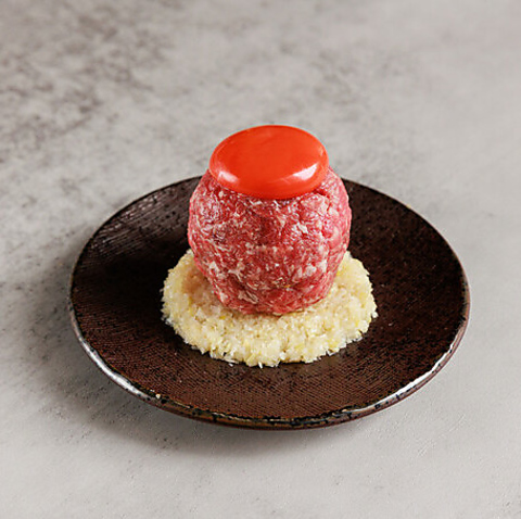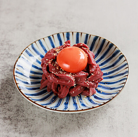 卵黄が艶やかに輝く「タレユッケ」は、厳選された生肉の濃厚な旨みをダイレクトに味わえる至高の逸品です。渋谷区の認可を受けた施設だからこそ提供できる料理の数々と秘伝のタレが織りなす極上のハーモニーをご堪能ください。シンプルながらも圧倒的な存在感を放つ美しい一皿です。
