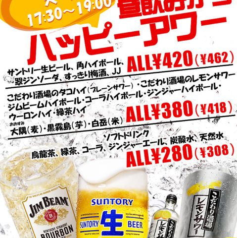 【17:30~19:00まで毎日開催!】超お得なHAPPY HOUR【日曜日は12:00~18:00昼のみから開催】