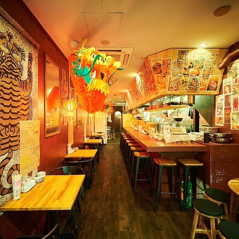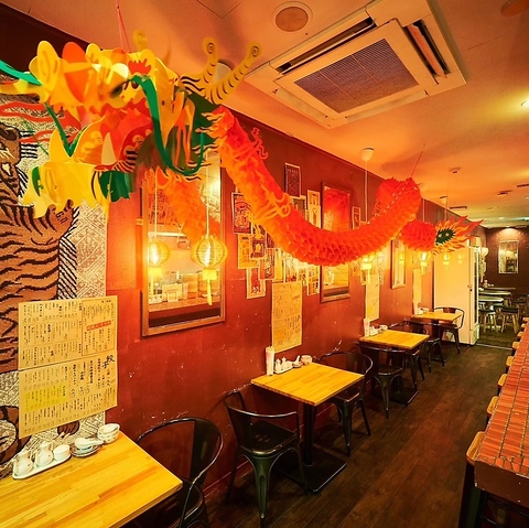 【中華レトロなおしゃれ空間で本格中華を堪能☆】2名様からご利用頂けるテーブル席も多数ご用意しております!中国酒が並んだショーケースがひと際目を惹く当店は、一歩店内に足を踏み入れると、鮮やかな装飾や張り紙が散りばめられたおしゃれな空間が広がります☆サクのみやデートにもピッタリです!