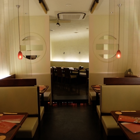 白を基調とした壁とオレンジ色のライトでムーディーな雰囲気が漂います。ゆったり寛げるソファ席でお食事をお楽しみいただけます。