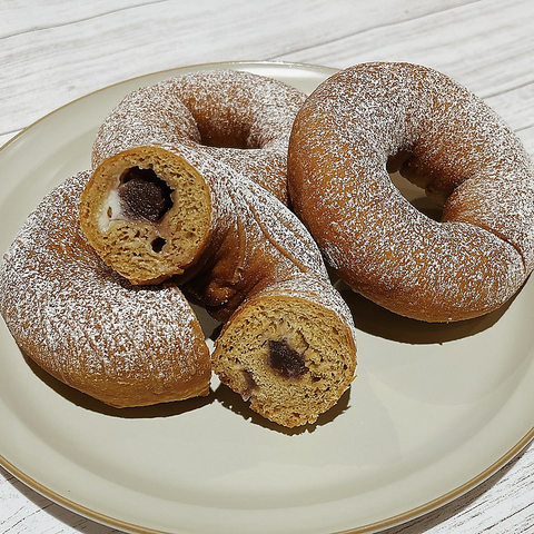 十勝産のこしあんことイタリア産のマスカルポーネクリームを、コーヒー風味のドーナツ生地にリング状に包みました。こしあんことマスカルポーネのなめらかな味わいがほんのり香るコーヒー風味と良く合います。