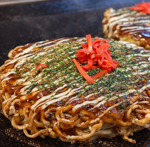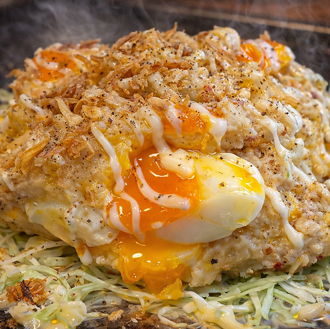 関西風の鉄板料理は本場にも負けないクオリティ!じっくりと時間をかけてふわふわに焼き上げたお好み焼きに、特製の濃厚チーズソースを惜しげもなくかけた贅沢な一品。とろりと溢れ出すソースが生地を包み込み、口の中で重なり合うコクと旨味がたまりません。「たぎつや」ならではの味わいを、ぜひ熱々のうちにご堪能ください◎