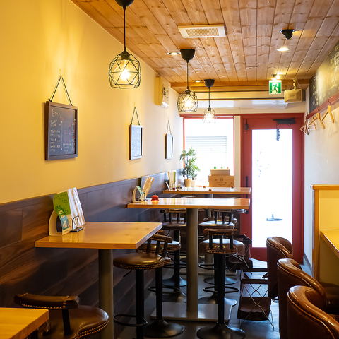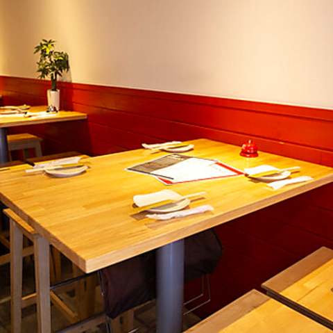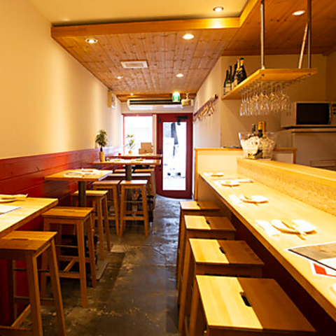 木目調のインテリアと、赤で統一された明るい雰囲気の店内。グループ利用にもぴったりなテーブル12席と、お一人様も気軽にお楽しみいただけるカウンター5席を完備しております◎少人数でもお好きなものをご注文いただきやすいよう、少量サイズでのご提供も嬉しいポイント♪