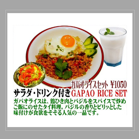 〈サラダ・ドリンク付き〉ガパオライスは、鶏ひき肉とバジルをスパイスで炒めご飯にのせたタイ料理。バジルの香りとピリッとした味付けが食欲をそそる人気の一品です。