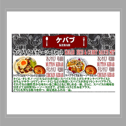 タイム・オレガノ・バジルなどの香り高いスパイスで仕上げたチキンケバブライスとガラムマサラ・コリアンダー・クミンなどの奥深いスパイスが香るマトンケバブライス。それぞれの個性豊かな味わいをご飯とともに楽しめる一皿。さらに、スパイスの風味を引き立てる特製カレーソース付きで、より深いコクと旨みをプラス。どちらも異なる魅力を持つ、満足感あふれる一品。