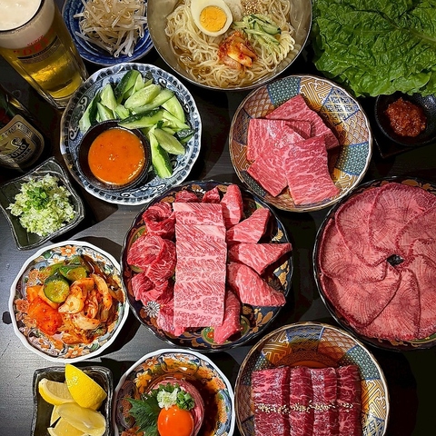 縁の焼肉を心ゆくまで楽しむことができます♪ユッケ、キムチ盛り合わせなど、焼肉に欠かせない一品が勢ぞろい!さらに、厚切り上塩タン、上ハラミ・上ロースなど、豪快な焼肉をたっぷりと堪能できます!