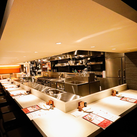 【料理人が見えるカウンターキッチン】一品一品心を込めて調理する料理人の業が見られるお席も人気です。お一人様から大歓迎!お仕事終わりのサク飲みやご友人、大切な方と隣同士でのお食事にもおすすめです◎お気軽にご利用ください♪