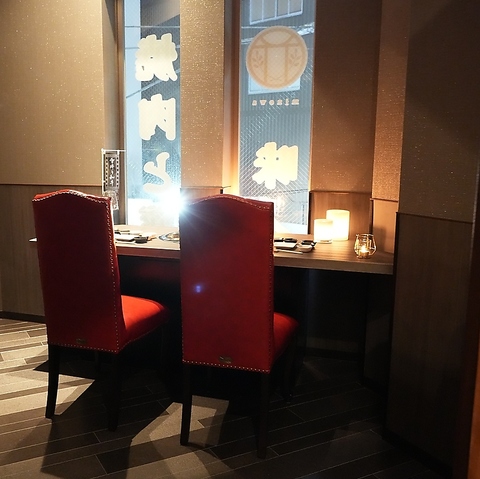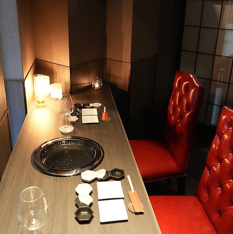 2名様カウンター個室です。デートや記念日利用などにもピッタリの個室です。キャンドルの灯りがムード満点の演出で雰囲気◎の個室となっております。人気のお席のため事前にご予約ください。