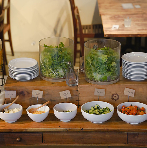 【11:30-15:00のランチタイムのみ】広い空間を活かしたこちらのサラダビュッフェは開店当初からご好評をいただいておりますシャルボン名物!日替わりのスープ、数々のトッピングアイテムから豊富で新鮮なお野菜をお時間の許す限りご堪能くださいませ!!なお、全てのランチメニューにサラダビュッフェが付いております。