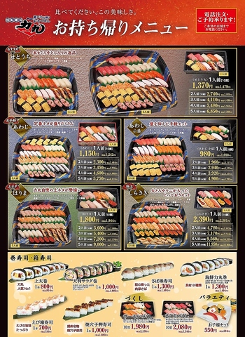 平日11~15時限定!!【1】春の旬盛りランチ1518円(込)【2】定番にぎりランチ1078円(込)【3】おすすめ鮮魚ランチ1496円(込)【4】ごちそうにぎりランチ1650円(込)【5】一日五食!まる得限定ランチ1430円(込)【6】上ネタ満腹握りランチ1540円(込)【7】特選ランチ1980円(込)