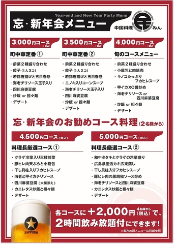 その他メニュー100品以上忘年会、新年会メニューあります飲み放題コースもございます