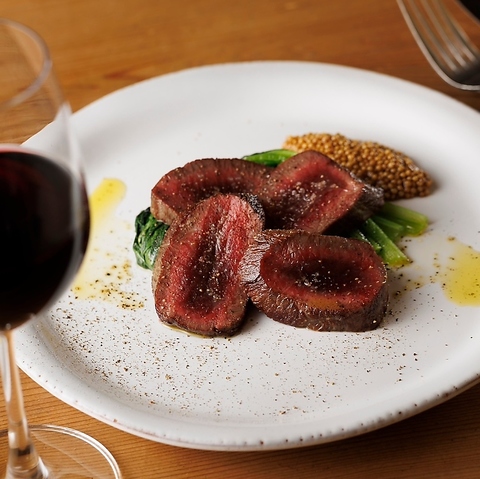 岐阜県の大自然でのびのびと育った鹿肉を、じっくりとローストしました。鹿肉特有の繊細な風味と、驚くほど柔らかくジューシーな肉質が特徴です。添えられた粒マスタードは、鹿肉の奥深い旨味を一層引き立てる絶妙なアクセント。赤ワインとの相性も抜群で、一口ごとに広がる豊かな香りと深い味わいをご賞味あれ。