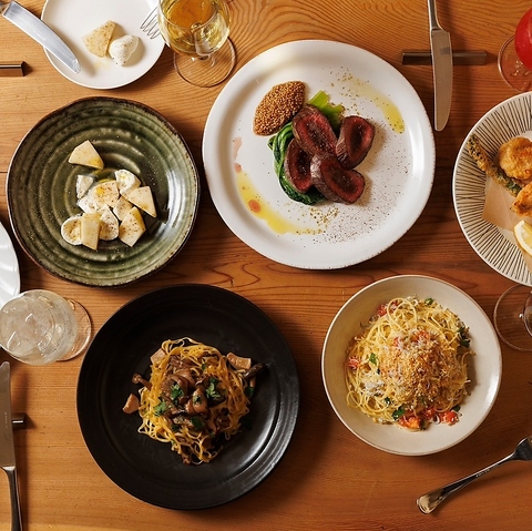 新鮮な水牛モッツァレラを使ったカプレーゼや、旬のしらすと大葉が香るサラダなど、素材の味を最大限に引き出した前菜で食欲をそそります。さらに、合鴨ロースや岐阜県産鹿肉など、厳選された肉を丁寧に調理し、肉本来の旨味を存分に引き出した一皿は、まさに当店のこだわりが詰まった逸品です。豊かな味わいをお楽しみくださいませ♪