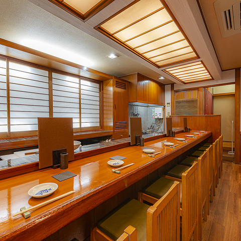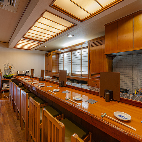 【カウンター席】一直線に並んだカウンター席を7席ご用意しております。料理を目の前で創るライブ感をお愉しみいただけるお席です♪お1人様でのご利用はもちろん、デートやご友人とのご利用にもオススメです!
