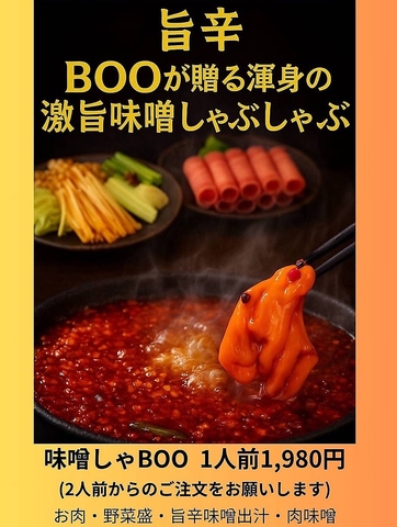 BOOがお届けする激旨味噌しゃぶしゃぶです。肉味噌の深みのあるコクと豚肉との組み合わせをお楽しみください♪※2人前よりご注文を承ります