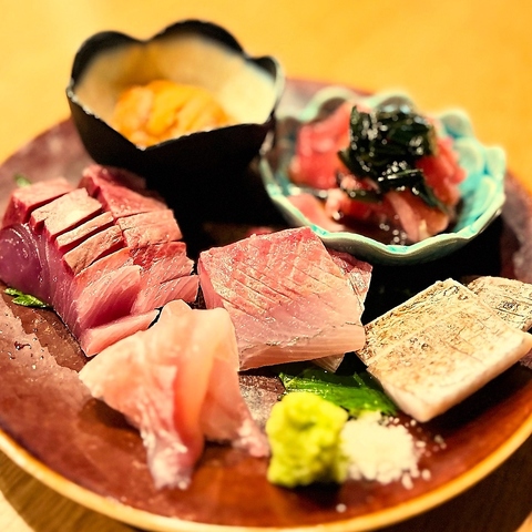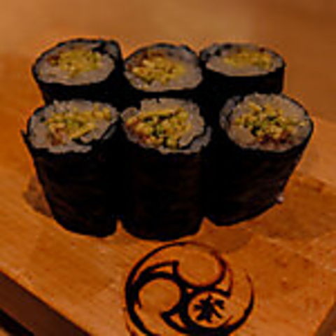 旬の食材を巻いたあて巻き。それぞれの時期に合った具材にほのかな湯葉の香りが交わる贅沢な酒の肴。写真は上から芽ネギロード、肉味噌キムチ、炙りサーモンいくらのせ。全部で14種類のあて巻きがあり、お好みに合わせた味が楽しめます。是非日本酒と一緒にお召し上がりください。
