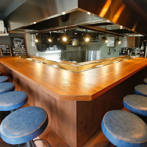 デザインにこだわった1Fのカウンター席は、炭場に砂を入れた珍しいスタイルの焼き場が目を惹く大人の特等席です。お一人様でのお食事も大歓迎ですのでぜひご利用ください。