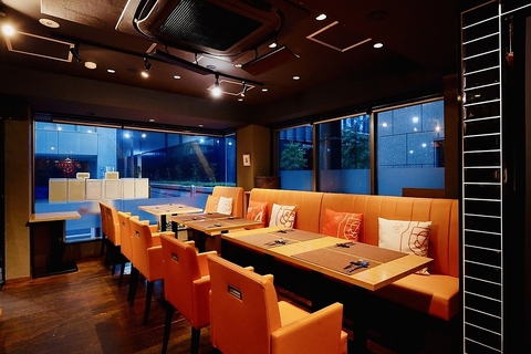 ◆最大14名様までお座りいただけるソファー席◆貸切の場合は最大18名様までご利用可能!黒のタイル張りの壁と個性的なオレンジのソファ席が特徴のオシャレな空間。開放感あふれる窓があるので、ゆったりとお寛ぎ下さい。各種宴会や歓送迎会・忘新年会・団体様・ママさん会などなど幅広いシーンでお気軽にご利用頂けます♪