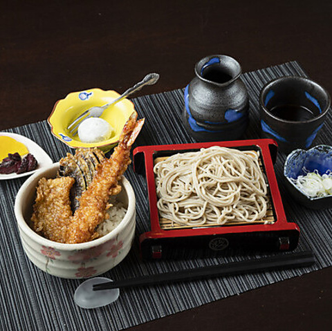 ミニサイズのそばと天丼を両方とも楽しめるお手頃で贅沢なセットメニューです。こだわりのだしが効いたつゆでいただくそばは風味豊かでのど越し抜群。天ぷらにもしっかり味が染み込み、食欲をそそります。ミニサイズでもボリューム満点なので満足感も抜群。さっぱりできるお漬物とアイス付きです。ぜひご賞味ください。