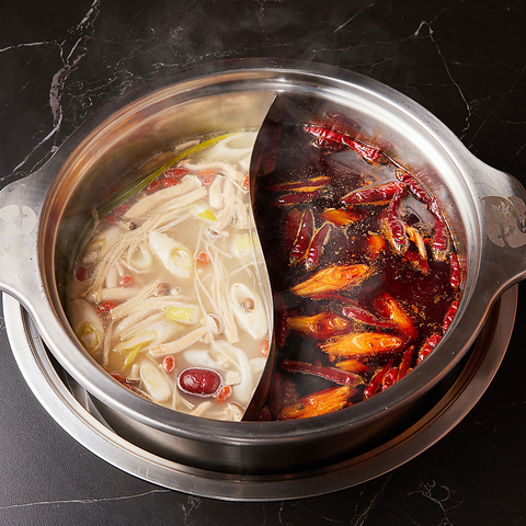 数種類の漢方と香味野菜をじっくり煮込み、まろやかで奥行きのある味わいに仕上げた白湯スープと花椒の痺れと唐辛子の辛さが食欲を刺激する麻辣スープの2種を同時に楽しめる本格火鍋。やさしいコクと刺激的な辛さ、対照的な味わいが食材の魅力を引き立て、最後まで飽きずに楽しめる火鍋です。